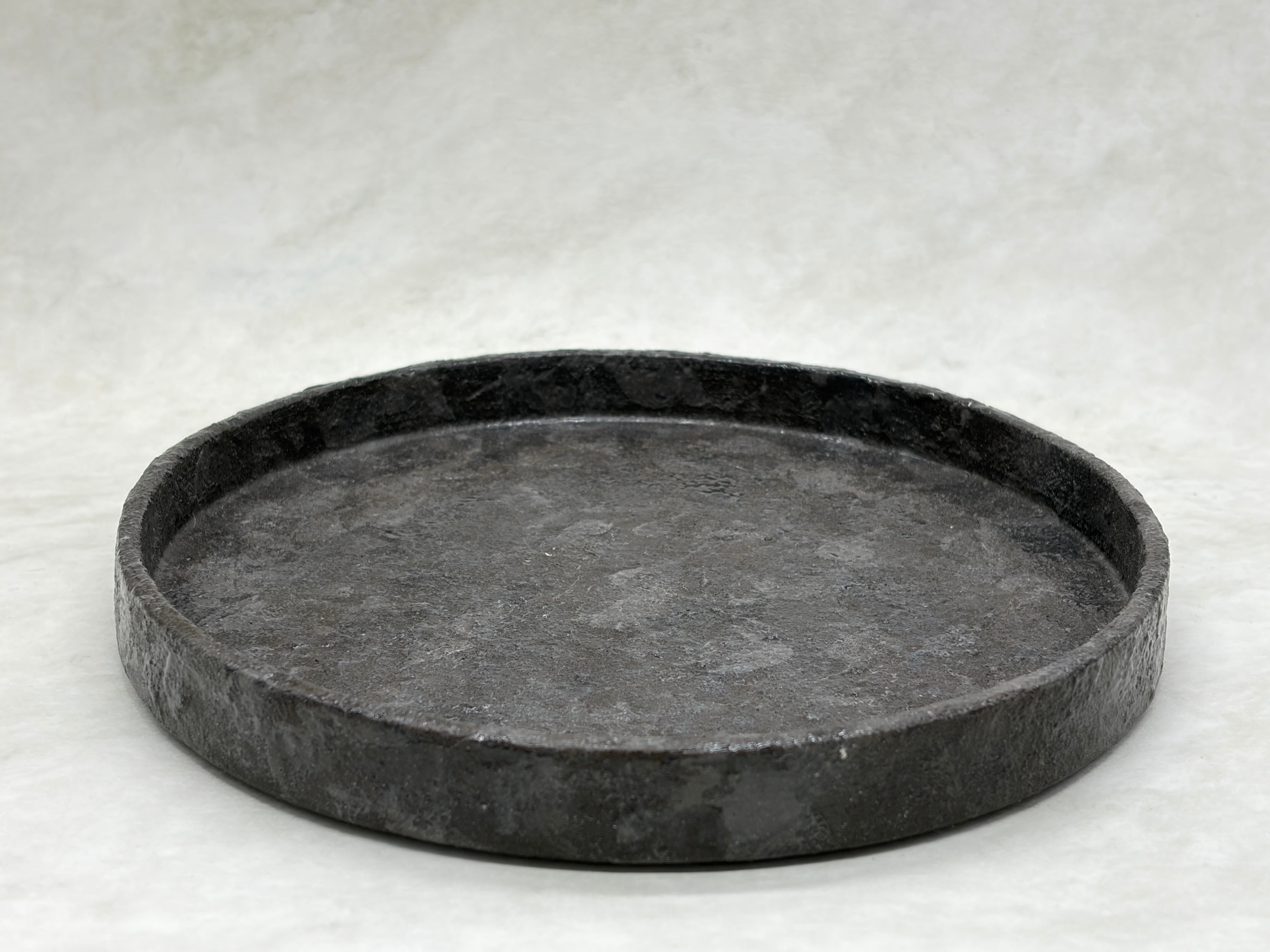 約18cmのプレート皿です。シックな黒と落ち着きのあるグレーの2色展開で、どんな食卓にもスタイリッシュな雰囲気を添えます。作品はすべて手作業によるもので、風合いや色合いが一点ずつ異なり、個体差がございます。形状に若干の歪みやたわみが見られることがあり、画像に写っているものが必ずしもお手元に届くわけではございませんので、予めご理解の上、ご注文をお願いいたします。
