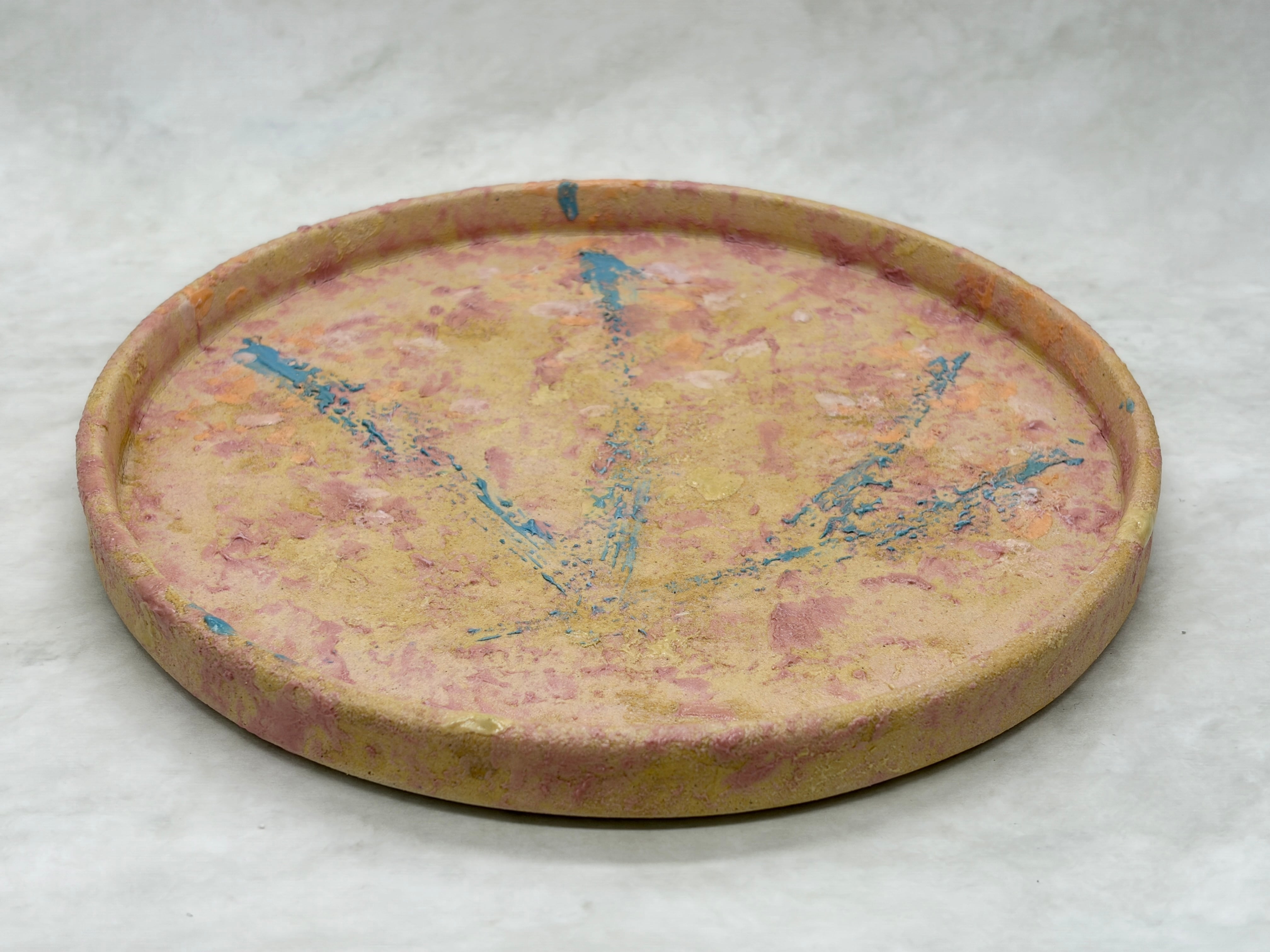 約21cmのプレート皿です。鮮やかな黄色、柔らかな桜色、爽やかなターコイズの3色展開で、どんな食卓にも彩り豊かな雰囲気を演出します。作品はすべて手作業によるもので、風合いや色合いが一点ずつ異なり、個体差がございます。形状に若干の歪みやたわみが見られることがあり、画像に写っているものが必ずしもお手元に届くわけではありませんので、何卒ご理解の上、ご注文をお願いいたします。